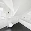 Das Badezimmer ist an Wänden und am Boden mit Fliesen belegt. Es ist mit einer Badewanne/Dusche, einem Waschbecken und einem WC ausgestattet.