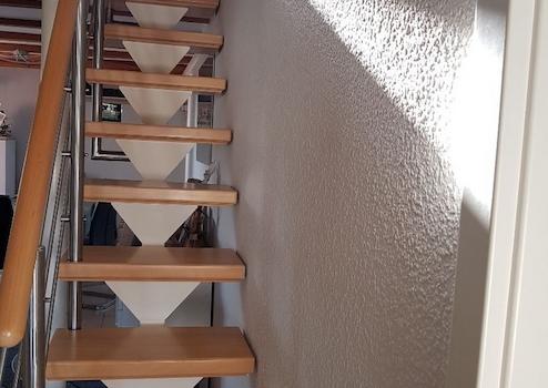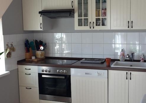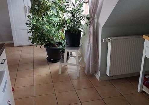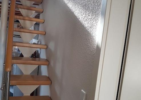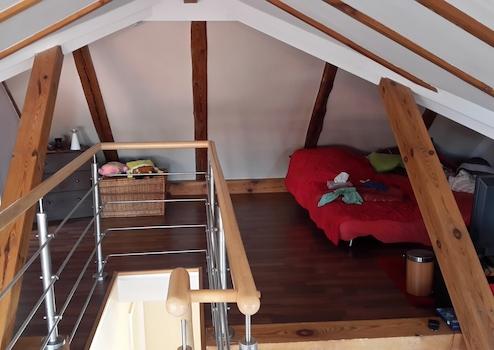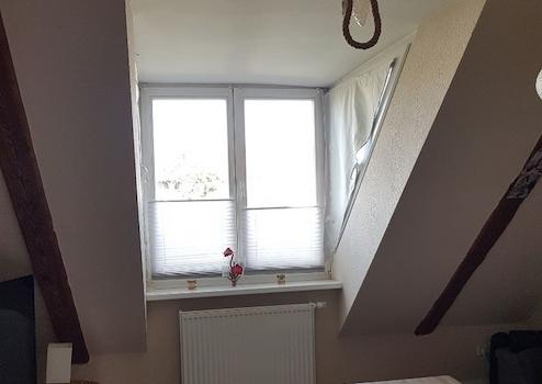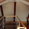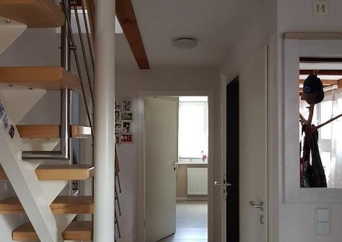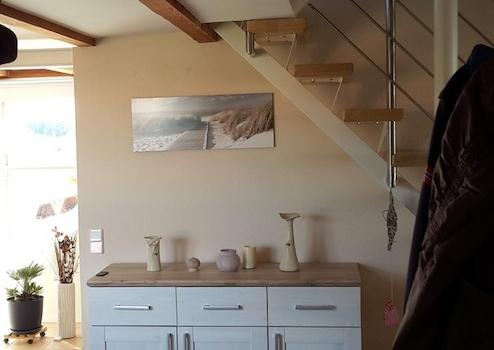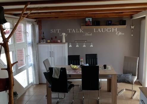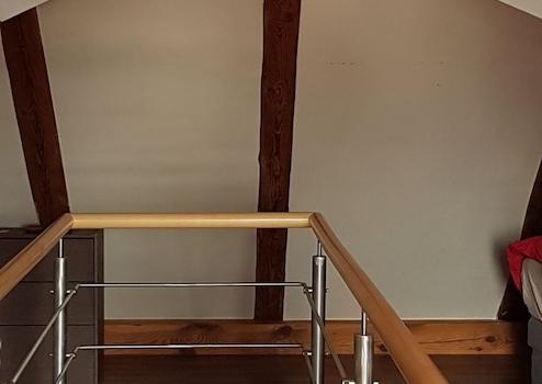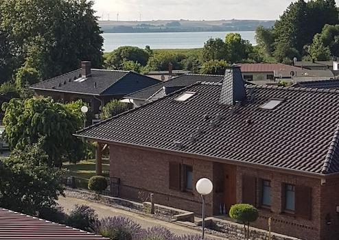 Vom lichtdurchfluteten Wohn- Küchenbereich, sowie vom Schlafzimmern läßt sich der See erblichken. Der Kirchturm meldet am Tag die Uhrzeit und ist in Sichtweite. Im Wohnraum und Schlafzimmer sind Terracotta Fleisen verlegt. Es gibt viele Schrägen, sodass die tatsächliche Nutzfläche etwa 95m² entspricht.