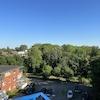 Das kombinierte Wohn- und Schlafzimmer sowie der gemütliche Balkon liegen zur ruhigen Rückseite des Hauses und bieten einen weiten, grünen Ausblick über Bäume und die umliegende Nachbarschaft – ideal zum Entspannen nach Feierabend.