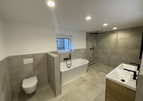 - Moderne Badausstattung mit Großformatfliesen und Armaturen von Hans-Grohe