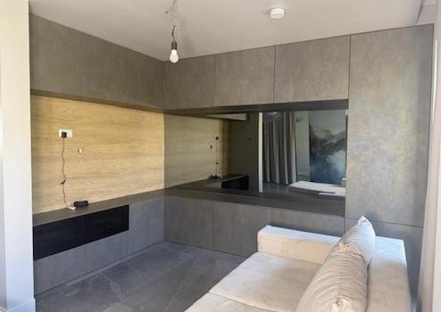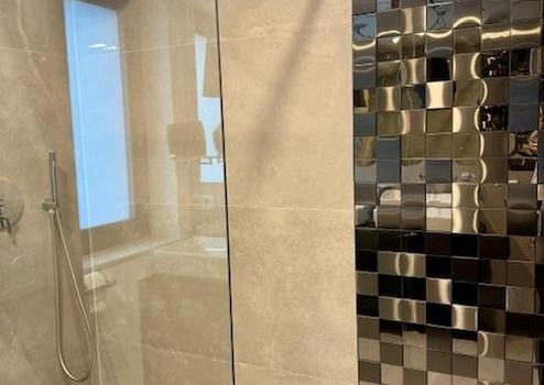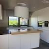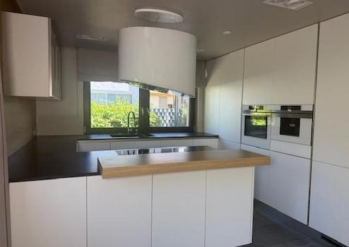Moderne, komplett ausgestattete Einbauküche mit Siemens Geräten (großes Kühlschrank, eingebaute Kaffeemaschine, Backofen mit Dampfgarer, Spülmaschine, Herdplatte) sowie Falmec Abzugshaube