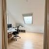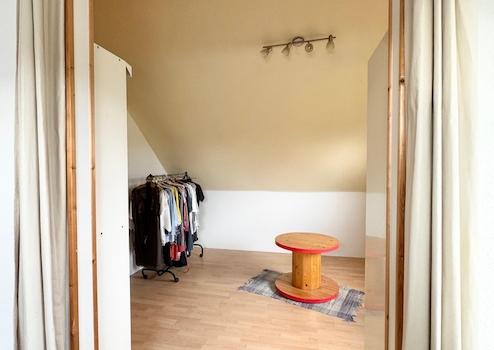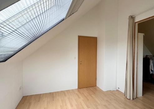 Im Dachgeschoss stehen ein Elternschlafzimmer, mit abgehängter Decke für Stauraum, sowie zwei weitere Zimmer ( aktuell mit Durchgang ) und ein Bad mit Dusche, Badewanne und zwei Einbau-Waschbecken und ein kleiner Dachboden zur Verfügung.