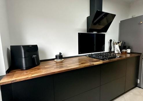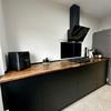 Moderne Einbauküche (2024): Stilvolle dunkle Fronten, Echtholz-Arbeitsplatte, hochwertige Elektrogeräte.