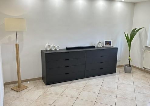 Die stilvolle Einbauküche aus dem Jahr 2024 überzeugt mit hochwertigen dunklen Fronten, einer Echtholz-Arbeitsplatte und modernen Elektrogeräten. Das Badezimmer wurde 2015 erneuert, verfügt über zwei Fenster und bietet ein helles, freundliches Ambiente.