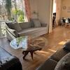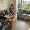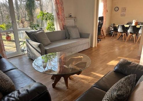 •Das Wohnzimmer verfügt über ein großes bodenlanges Fenster und einen Zugang zur Terrasse, die an den Garten anschließt. Der Garten liegt an einem kleinen Bach, der an den Wald grenzt.