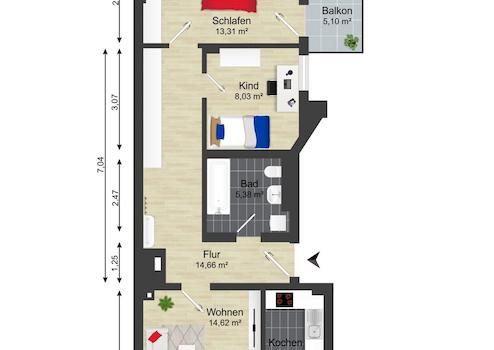 Die 3-Raum-Wohnung im 1. Obergeschoss ist wie folgt aufgeteilt: