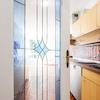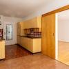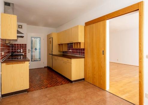 Die angrenzende Küche ist mit einer gepflegten Einbauküche im authentischen Stil der 80er Jahre ausgestattet, funktional, charakterstark und mit viel Potenzial für eine moderne Neugestaltung.