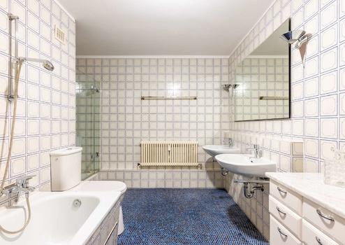 Das großzügige Badezimmer befindet sich in außergewöhnlich gutem Zustand: Das originale Design aus den 1980er Jahren wurde so sorgfältig erhalten, dass es nahezu neuwertig wirkt. Neben Dusche und Badewanne bietet es viel Raum und Komfort. Ergänzend steht ein separates Gäste-WC zur Verfügung.