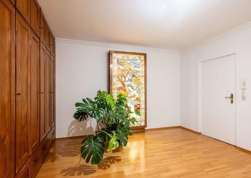 Bereits im Eingangsbereich zeigt sich die besondere Atmosphäre dieser Wohnung: Ein maßgefertigter Einbauschrank aus hochwertigem Holz fügt sich nahtlos in die Wand ein und schafft stilvollen Stauraum. Ein kunstvoll beleuchtetes Glasgemälde in einem hinterleuchteten Kupferrahmen verleiht dem Entrée zusätzlich eine warme, einladende Ausstrahlung.