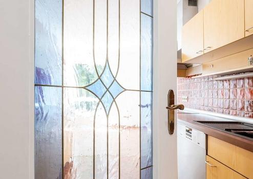 Alle Wohnräume sind mit elegantem Deckenstuck versehen – eine stilvolle Reminiszenz klassischer Baukultur. Ein weiteres Highlight ist die handgefertigte Holzrahmen-Glastür mit blau-weißen Ornamenten zwischen Küche und Flur, ein echtes Unikat, das die kunstliebende Handschrift des Vorbesitzers unterstreicht.