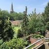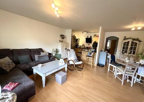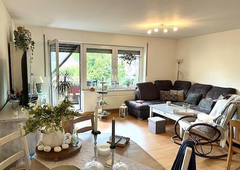 Vom Wohnzimmer haben Sie Zugang auf die Loggia (SW-Lage), mit einem schönen Blick in umliegende Gärten bis hin zum Kirchturm.