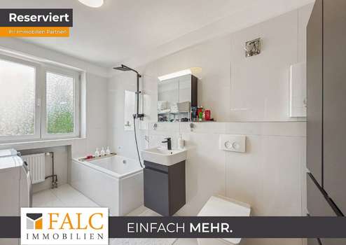 Das Badezimmer wurde komplett erneuert und besticht durch eine strahlend moderne Ausstattung. Hochwertige Fliesen, stilvolle schwarze Armaturen und eine komfortable Duschbadewanne sorgen für ein elegantes Ambiente. Ein Waschmaschinenanschluss ist hier selbstverständlich integriert.