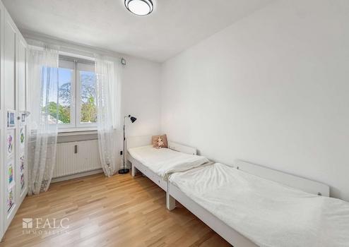 Der private Bereich umfasst ein geräumiges Schlafzimmer sowie zwei weitere Kinderzimmer, die sich auch hervorragend als Büro oder Gästezimmer nutzen lassen. Die Wohnung weist einen klassischen, zeitlosen Grundriss auf: Von der großzügigen Diele aus sind alle Räume direkt erreichbar.