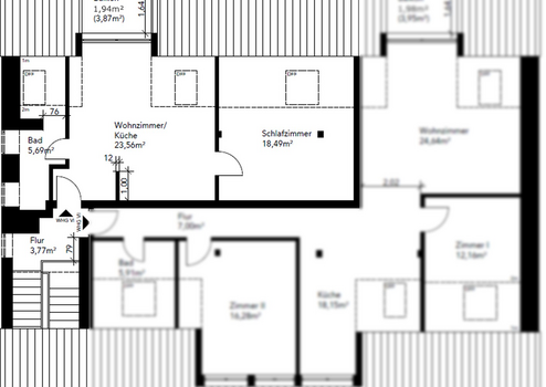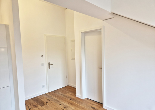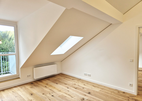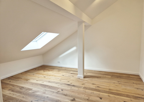 Insgesamt wirkt die Wohnung durch die nicht anrechenbaren Teile der Dachschrägen größer, als es die Quadratmeterangabe vermuten lässt. Direkter Nachbar auf dieser Etage ist lediglich der zukünftige Bewohner der zweiten Dachgeschosswohnung.