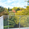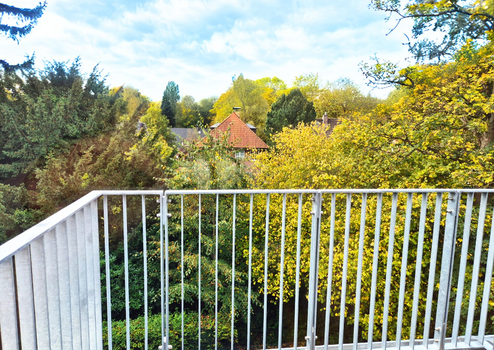 Die helle Ausleuchtung ergibt sich neben dem Dachfenster auch durch die große Gaube, von der aus man auf den Balkon gelangt. Der nach Südwesten ausgerichtete Balkon liegt rückseitig und somit ruhig zum Garten. Mit einer Fläche von knapp 4 m² bietet er Platz für einen kleinen Tisch und Stühle – der Blick kann hier ins Grüne schweifen.