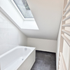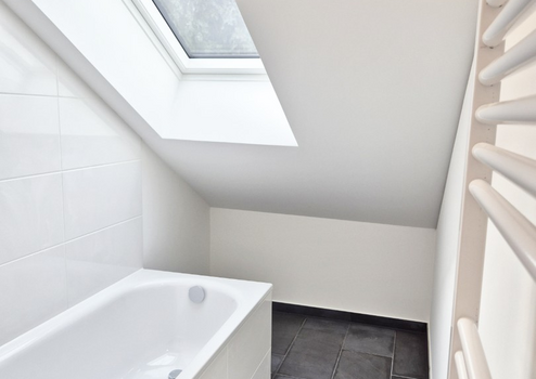 Vom Wohnzimmer aus gelangt man durch eine Tür in das ansprechende Badezimmer (ca. 5,7 m²) mit Badewanne, WC, Waschbecken und Spiegelschrank. Im Badezimmer sorgen neben dem Dachfenster auch zwei normale Fenster für eine helle und freundliche Atmosphäre.