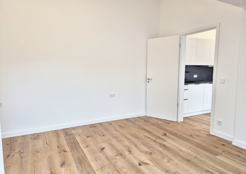 Das großzügige Wohnzimmer (ca. 23,5 m²) mit integrierter Küche bildet das Herzstück der Wohnung. Wie in allen Wohnräumen ist es mit modernem Echtholzparkett (Eiche) als Fußbodenbelag ausgestattet. Bereits hier erkennt man den besonderen Charme der Dachgeschosswohnung: Die gemütlichen Dachschrägen sind modern und dem natürlichen Aufbau des Daches sowie den tragenden Elementen nachempfunden. Im Wohnzimmer finden Esstisch, Couch und Fernseher – selbstverständlich mit Kabel- und Internetanschluss – sowie die vollständig mit hochwertigen Elektrogeräten ausgestattete Einbauküche ihren Platz.