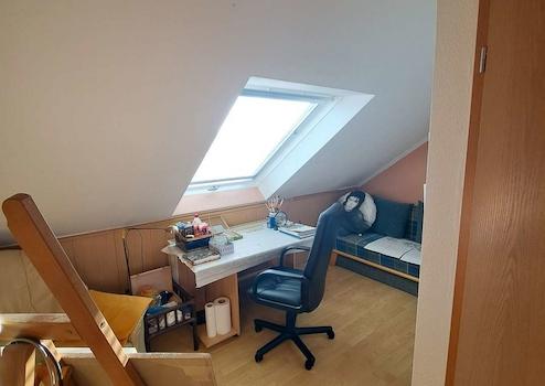 Das Dachgeschoss ist mit dem dritten Schlaf-/Arbeitszimmer gemütlich ausgebaut und könnte auch weiter unterteilt werden. In den unteren Schrägen ist zusätzlicher Stauraum vorhanden.