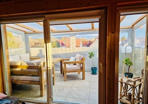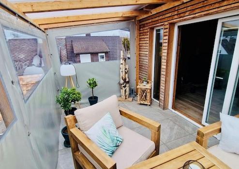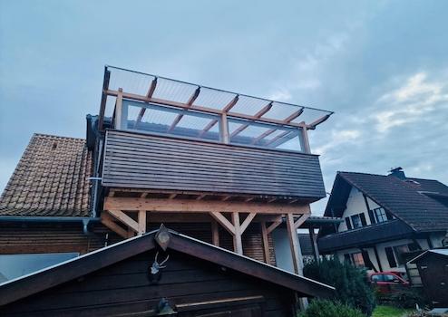 Überdachte Terrasse im OG + überdachte Terrasse im Garten