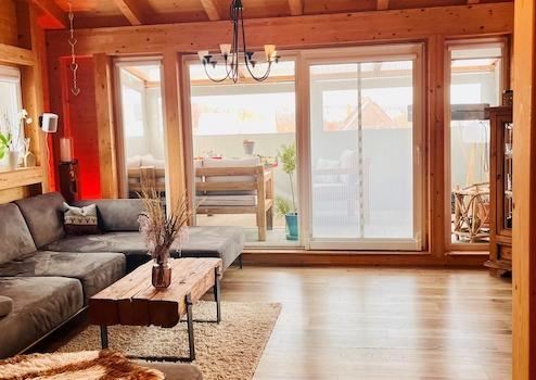 Kinderzimmer, Schlafzimmer mit Ankleidezimmer, Bad und ein sehr helles Wohnzimmer. Von hier aus geht es auf die große, überdachte Terrasse, die bei Bedarf rundum geschlossen werden kann – perfekt als zusätzlicher Wohnbereich vom Frühjahr bis weit in den Herbst.