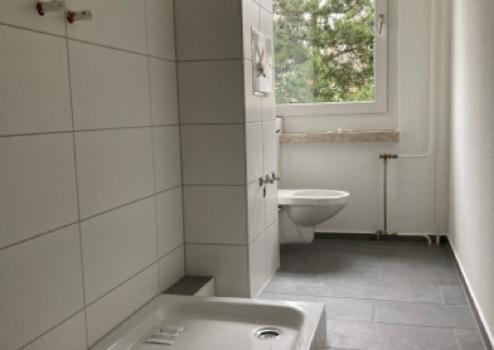- gefliestes Bad mit Dusche und Fenster