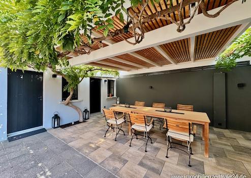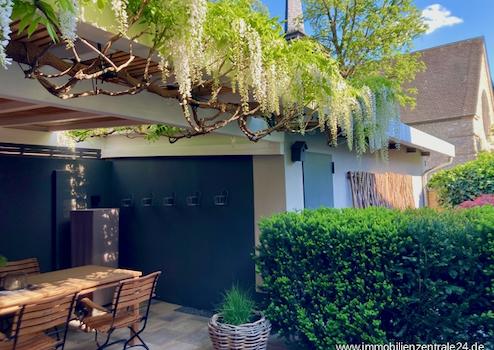 Das Außenareal überzeugt mit einer gepflegten Gestaltung: Eine Garage bietet Platz für ein Fahrzeug, zwei praktische Anbauten im Hof sorgen für zusätzlichen Stauraum, und eine charmante Gartenlaube lädt zum Verweilen im Grünen ein.