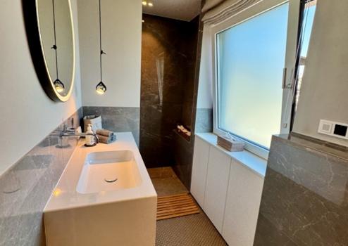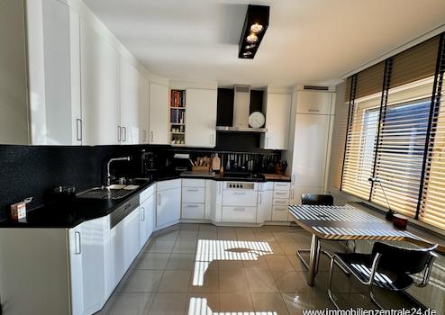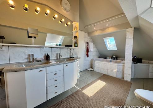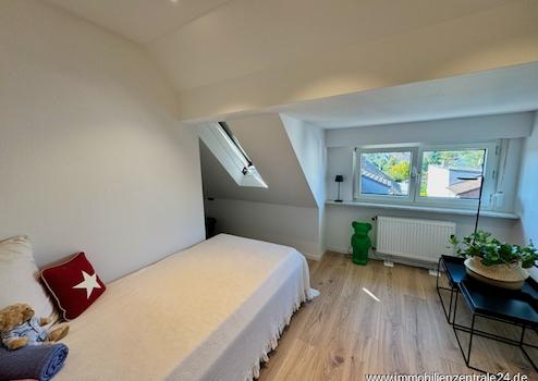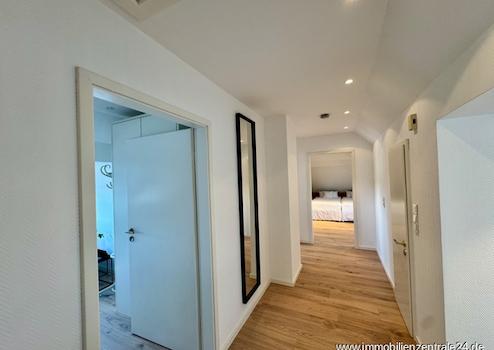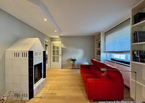 Der Wohnbereich erstreckt sich über das erste Obergeschoss und das Dachgeschoss. Über die einladende Diele im Erdgeschoss gelangt man in das erste Obergeschoss, das mit seiner durchdachten Raumaufteilung und der hellen Atmosphäre besticht. Hier befinden sich das Esszimmer, das gemütliche Kaminzimmer sowie das Wohnzimmer mit direktem Zugang zur großen, sonnigen Dachterrasse – ein idealer Ort zum Entspannen und Genießen. Die separate Küche ist mit einer modernen Einbauküche und hochwertigen Markengeräten ausgestattet. Ein neuwertiges Duschbad aus dem Jahr 2019 rundet diese Etage perfekt ab.