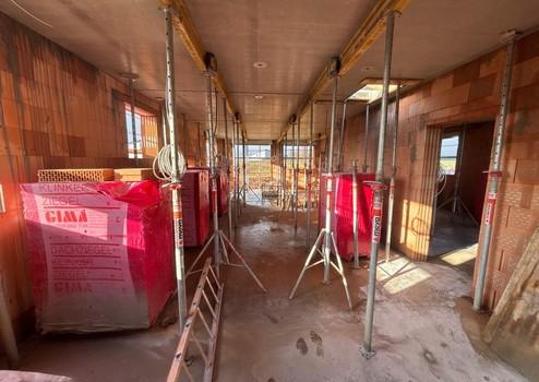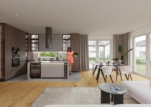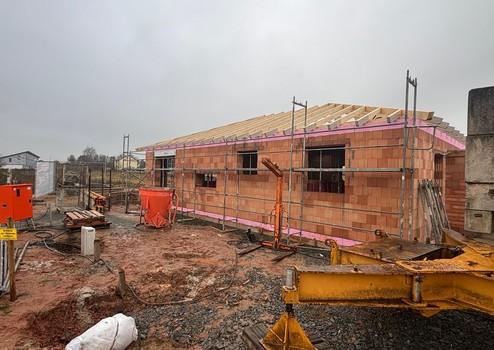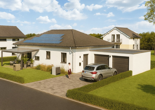 Der massiv gebaute Neubau-Bungalow wird derzeit errichtet und ist ab Juli 2026 bezugsfertig. Das Gebäude bietet ein ebenerdiges Wohnkonzept mit einem offenen Wohn-, Ess- und Kochbereich, der direkt an den Eingangsbereich anschließt. Die Küche mit Kochinselvorbereitung verfügt über einen separaten Abstellraum. Der Hauswirtschaftsraum verbindet das Wohnhaus mit der Doppelgarage und sorgt so für kurze Wege.