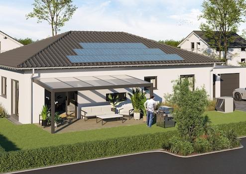 Der Grundriss umfasst zwei flexibel nutzbare Zimmer sowie einen Elternbereich mit Schlafzimmer, zwei Ankleiden und zwei direkt angeschlossenen Bädern. Ein weiteres Gäste-Bad ist zentral im Haus angeordnet. Die nach Süden orientierte Terrasse ist mit einer Aluminium-Terrassenüberdachung geplant und dient als erweiterter Wohnbereich im Freien.