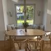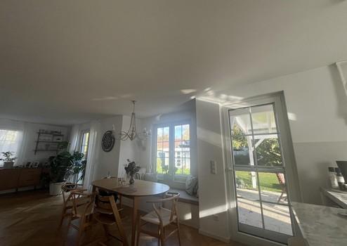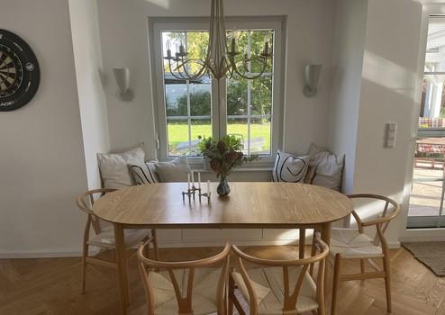 Weiter geht’s in den lichtdurchfluteten Wohn Essbereich, der mit maßgefertigten Einbaumöbeln, wie der Sitzbank mit Stauraum im Erkerfenster ausgestattet ist.