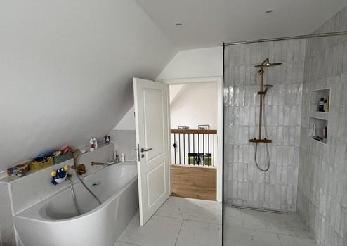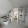 Das große Masterbad reizt durch die riesige begehbare Dusche, den Doppelwaschtisch, eine halb-freistehende Badewanne und den Wäscheabwurf zum HWR.
