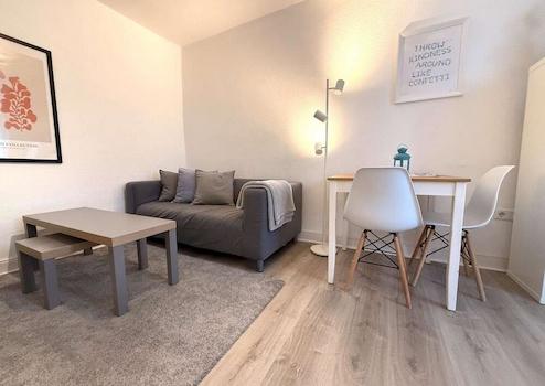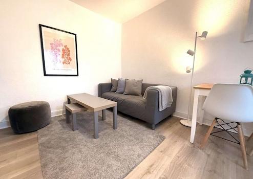 Die gesamte Wohnung ist mit einem hochwertigen Vinylboden in Holzoptik ausgelegt, sie bietet ein Wohnzimmer mit integrierter Küche, ein separates Schlafzimmer und ein neues Tageslichtbad. Der Wohnbereich ist mit einem modernen Sofa, 2 Beistelltischen und einem Smart-TV-Flachbildschirm eingerichtet. Die Einbauküche mit weißen Fronten lässt keine Wünsche offen: Ceranfeld mit Backofen und Dunstesse, eine Spülmaschine, eine Kühl- Gefrierkombination und eine Mikrowelle werden hier neben Kochutensilien und Geschirr zur Verfügung gestellt. Außerdem gibt es einen Esstisch für 2 Personen. Das separate Schlafzimmer bietet ein Doppelbett (1,40 x 2,00m) mit Nachttisch, einen Kleiderschrank und ein weiteres SmartTV-Gerät. Ein Highlight ist das neue Tageslichtbad mit einem Hänge-WC, einem Waschtisch mit Kosmetikschrank, einer gläsernen Duschkabine und einem Handtuchwärmer. Hier steht die Waschmaschine zur alleinigen Nutzung. Bettwäsche und Handtücher werden gestellt. Der Mietpreis beträgt € 950,00 für eine Person inklusive aller Energie- und Nebenkosten, der Nutzung des PKW-Stellplatzes und des Internetzugangs. Der Mietpreis für 2 Personen beträgt 1100,00. Die Endreinigung zahlt der Mieter. Sie erfolgt nach Aufwand und wird mit derzeit € 35,00 pro Stunde abgerechnet.