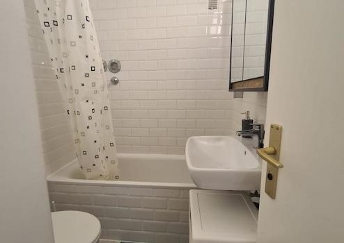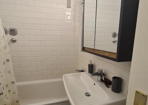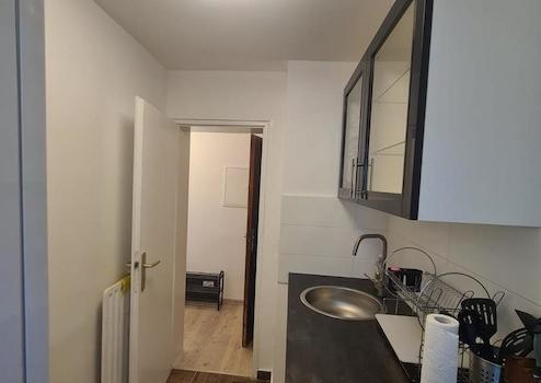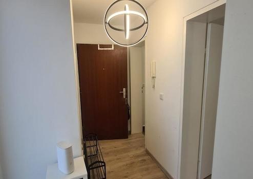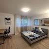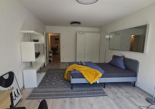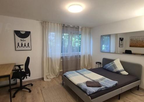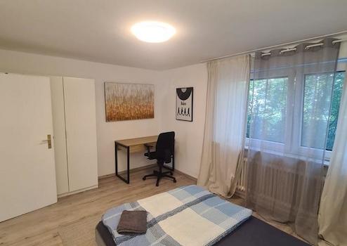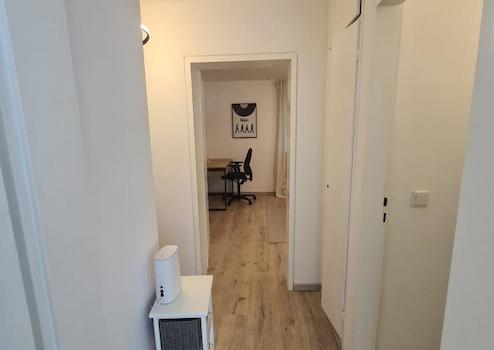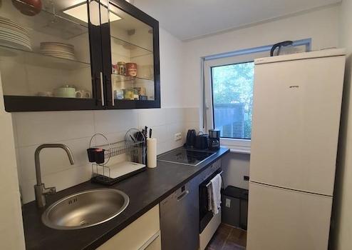 Die Wohnung bietet 2 vollwertige Schlafzimmer, beide mit Boxspringbett, Kleiderschrank und Schreibtisch. Separate Küche mit Spülmaschine und verschiedenen Küchenutensilien.
