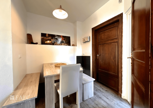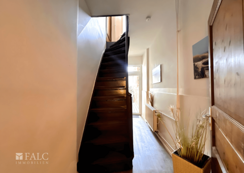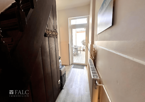 Schon beim Betreten des Hauses spürt man den besonderen Charme der traditionellen Bauweise, verbunden mit den modernen Vorzügen einer umfassenden Sanierung aus dem Jahr 2015. Der Eingangsbereich führt zunächst in einen kleinen Flur, von dem aus sich geradewegs der Zugang zum Innenhof mit Terrasse und praktischem Abstellraum eröffnet – ein geschützter, idyllischer Ort für erholsame Stunden im Freien.