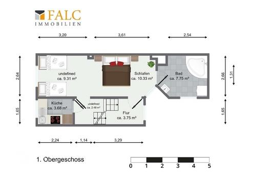 Über eine zentral gelegene Treppe erreicht man das erste Obergeschoss. Dort befinden sich ein Wannenbad, ein praktisches Büro sowie eine weitere kleine Küchenzeile – ideal beispielsweise für ein kleines Homeoffice oder als separate Wohneinheit nutzbar.