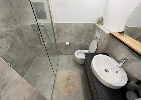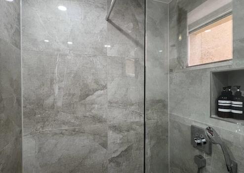 *Begehbare Regendusche (Hans-Grohe) und Nischen im Badezimmer*