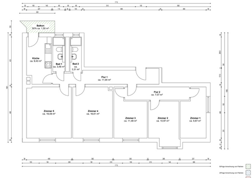 Auf rund 103 m² Wohnfläche verteilen sich fünf separat begehbare Schlafzimmer, zwei moderne Duschbäder sowie eine große, helle Einbauküche mit vollständiger Ausstattung.