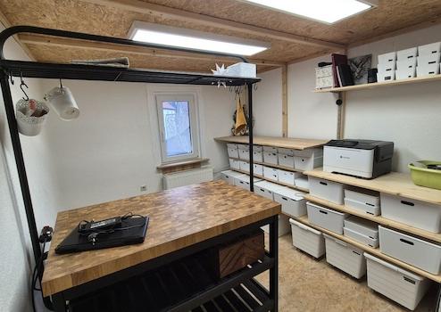 Bebauung: Wohnhaus, Lagerkeller, Garage, Bungalow, zwei Nebengebäude, große Scheune (16 m × 6 m)
