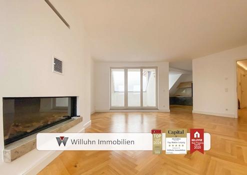 Das Herzstück der Wohnung bildet der weitläufige und lichtdurchflutete Wohn- und Essbereich mit halboffener Küche. Der edle Echtholzparkettboden in Fischgrätverlegung schafft eine warme Atmosphäre, während der elegante Kamin an kühleren Tagen für behagliche Stunden sorgt. Der verglaste Zugang zur Loggia in nord-west-Ausrichtung öffnet den Blick über die Dächer von Gohlis-Süd.