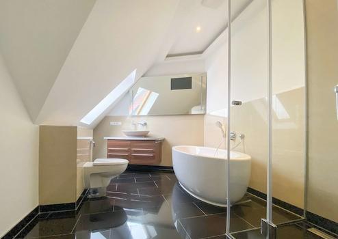 Die halboffene Küche fügt sich harmonisch in den Wohnraum ein und bietet ausreichend Platz für eine hochwertige Einbauküche sowie einen kleinen Frühstücksplatz mit Ausblick. Das etwa 24 m² große Schlafzimmer ist mit dem luxuriösen Tageslichtbad en suite verbunden. Hier erwartet Sie eine freistehende Wanne, eine ebenerdige Dusche, stilvolle Beleuchtung und ein intelligenter Spiegel mit integrierter TV-Funktion.
