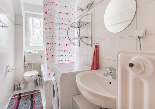 Erholung finden Sie in dem weiß gefliesten Duschbad. Ein Fenster sorgt für Tageslicht und eine optimale Belüftung. Platz für eine Waschmaschine wurde bei der Planung berücksichtigt.