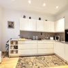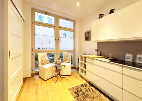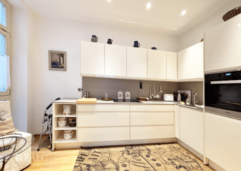 Die an das Wohnzimmer angrenzende, moderne Küche ist mit hochwertigen Markengeräten ausgestattet und bietet sowohl Funktionalität als auch Stil. Die freundliche Atmosphäre lädt zum gemeinsamen Kochen und Verweilen ein.