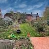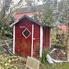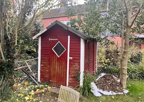 Im Garten befindet sich ein solides Gartenhaus, das auf einem Fundament errichtet wurde. Es eignet sich ideal zur Aufbewahrung von Gartengeräten, Fahrrädern oder anderen Utensilien und schafft so Ordnung auf dem Grundstück.