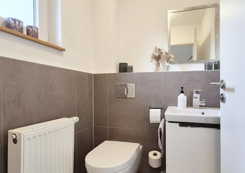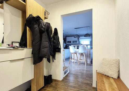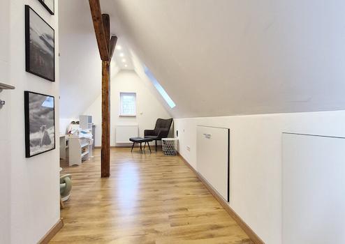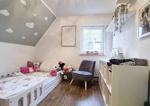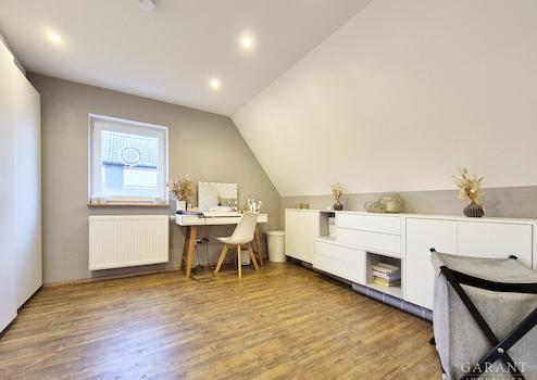 Im Obergeschoss finden alle ihren Lieblingsplatz: ein helles Kinderzimmer, ein behagliches Elternschlafzimmer mit eigener Ankleide sowie ein sonniges Familienbad. Besonders praktisch für den Alltag: ein Hauswirtschaftsraum mit Treppenaufgang in den ausgebauten Dachspitz, ideal als Rückzugsort, Hobbyraum oder zusätzliches Spielzimmer.