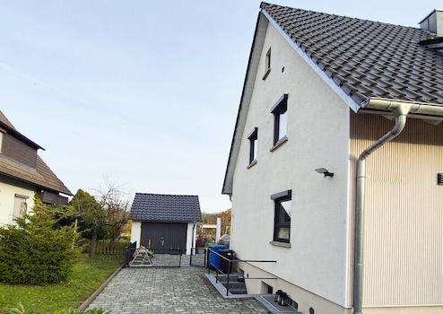 Praktisch: vor dem Haus stehen Ihnen drei Stellplätze zur Verfügung, seitlich befinden sich zwei weitere Stellplätze und für alle, die gerne werkeln, gibt es zusätzlich eine Garage, die sich ideal als Werkstatt nutzen lässt. Sie besitzt einen eigenen Sicherungskasten, Wasseranschluss und Netzwerkanschluss.