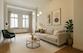 Die gefliesten Bäder sind lang und schmal. Im Grundriss als ein Tageslichtbad. Highlight der Eigentumswohnung sind die typischen Altbauelemente, wie Kassettentüren, Stuck, Stuckrosetten, Flügeltüren, Fischgrätparkett und Dielen. Aktuell ist der Auftrag erteilt worden, einen Schindler-Fahrstuhl anzubauen. Dieser wird schätzungsweise gegen Ende 2025/2025 Frühjahr fertiggestellt. Das Treppenhaus im Vorderhaus wird voraussichtlich nach der Fertigstellung des Fahrstuhls fertiggestellt. Es handelt sich beim Wohnzimmer um ein maßstabsgetreues Foto, das mit KI bearbeitet wurde. So oder ähnlich könnte der Raum nach erfolgter Renovierung und mit neuer Ausstattung aussehen.