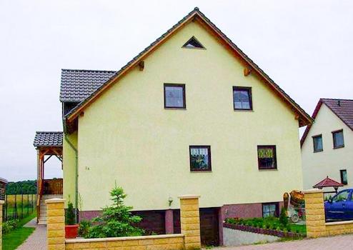 Das Haus ist mit 36,5 cm starken Hochlochziegeln und Betonmassivdecken gebaut. Die Außenwände sind mit einem Wärmedämmputz + Münchener Rauhputz verputzt. Die Innenwände sind ebenfalls massiv und mit Kalk-Zementputz verputzt.