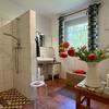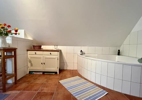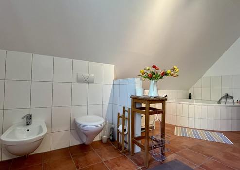Im großem Familienbad gehören eine Eckbadewanne, ein Bidet, ein WC, ein Waschbecken und eine ebenerdige Dusche zur Ausstattung.