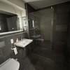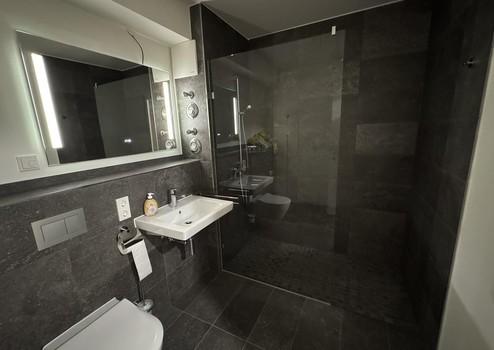 -Modernes Bad mit begehbarer bodengleicher Dusche, hochwertigen Armaturen, großzügigen Fliesen, großem Spiegel und Handtuch-Heizkörper
