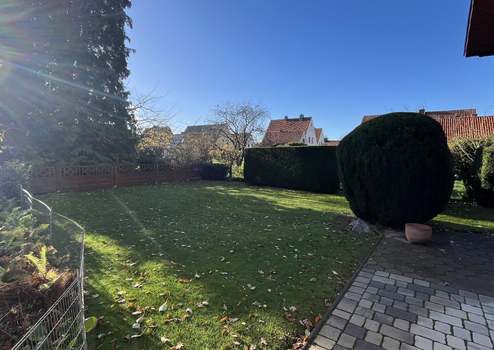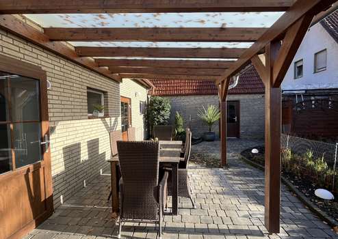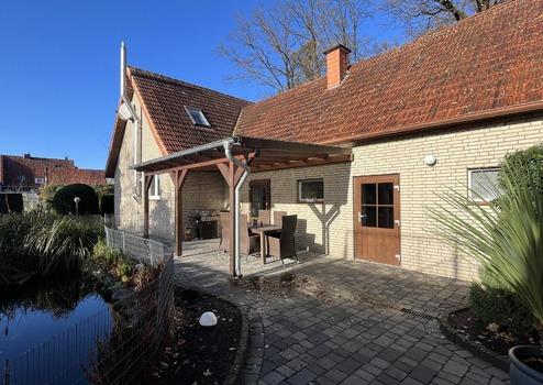 Werfen wir einen Blick nach draußen. 2012/2013 wurde die Terrasse neu überdacht. Von hier aus haben Sie einen tollen Blick auf den großen und idyllisch angelegten Teich mit Reinigungsanlage. Der Garten wird durch einen umfriedeten Rasenbereich mit einem Obstbaum und Hecken ergänzt. Hier können Sie all Ihre Gartenträume verwirklichen!